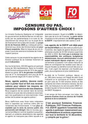 [Communiqué intersyndical DGFiP] Le ministre Guillaume Kasbarian et l’intégralité du gouvernement de Michel Barnier ont été censurés par les parlementaires à la suite du déclenchement de l’article 49.3 sur le projet de loi de financement de la Sécurité sociale. Le projet de loi de finances 2025 qui s’attaquait particulièrement aux droits des fonctionnaires est pour l’heure suspendu. Mais le risque de se voir imposer 3 jours de carence et la baisse de l’indemnisation perdure.