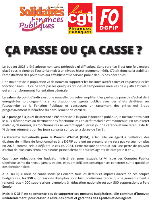 A la DGFiP, si nous ne connaissons pas encore tous les détails et impacts directs de ces coupes budgétaires, les 550 suppressions d’emplois sont bien confirmées tandis que le gouvernement a renoncé aux 4 000 suppressions d’emplois à l’éducation nationale ou aux 500 suppressions à Pôle Emploi !
