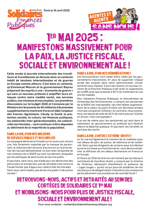 Cette année la journée internationale des travailleurs et travailleuses se déroule dans un contexte inédit de tensions internationales et de guerres en Europe comme ailleurs. C’est dans ce contexte, qu’Emmanuel Macron et le gouvernement Bayrou préparent les esprits à une « économie de guerre » qui sera un nouveau prétexte à amplifier leurs attaques contre notre modèle social, nos services publics, nos missions et nos emplois. Les premières discussions sur le budget 2026 et l’annonce par le Ministre de l’économie de 40 milliards d’économies supplémentaires montrent d’ores et déjà l’ampleur des futures régressions. L’école, la Santé, la protection sociale, la culture, les finances publiques, les solidarités inter-générationnelles, les collectivités territoriales... vont continuer à être dépecées au détriment de la majorité de la population.