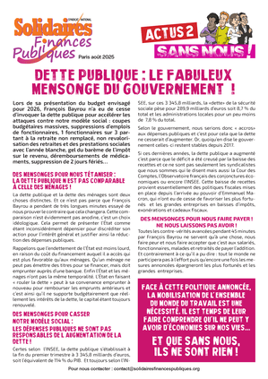 Lors de sa présentation du budget envisagé pour 2026 le 15 juillet, François Bayrou n’a eu de cesse d’invoquer la dette publique pour accélérer les attaques contre notre modèle social : coupes budgétaires massives, suppressions d’emplois de fonctionnaires, 1 fonctionnaire sur 3 partant à la retraite non remplacé, non revalorisation des retraites et des prestations sociales avec l’année blanche, gel du barème de l’impôt sur le revenu, déremboursements de médicaments, suppression de 2 jours fériés…