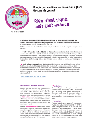 • Sur le volet santé et sur la solidarité, les choix de l’administration sont désormais clairs mais ils doivent encore être retranscrits dans un cahier des charges pour que le ministère lance la procédure de marché public ; le risque d’une attaque en justice par des cabinets d’avocats spécialisés au service des assureurs qui perdraient l’appel d’offre est réel ; Solidaires a cependant fait le choix d’une première information, voir le message interne aux Finances adressé à tous les agent.es par messagerie le 15 mars.